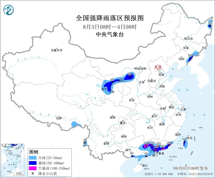 预计未来三天,青海东部、甘肃中部、宁夏、陕西北部、山西东部、内蒙古西部偏南地区、北京、天津、河北中南部、河南北部、山东西部以及广东、广西等地的部分地区有大到暴雨,局部地区有大暴雨,个别点有特大暴雨,并伴有短时强降水、雷暴大风或冰雹等强对流天气。预计3日8时至6日8时,甘肃中部、青海东北部、河北西部、广西东部、广东西部和中部等地部分地区发生山洪灾害可能性大(橙色预警)、地质灾害气象风险高(橙色预警),广西东南部等地部分中小河流有超过保证水位的气象风险(橙色预警)。