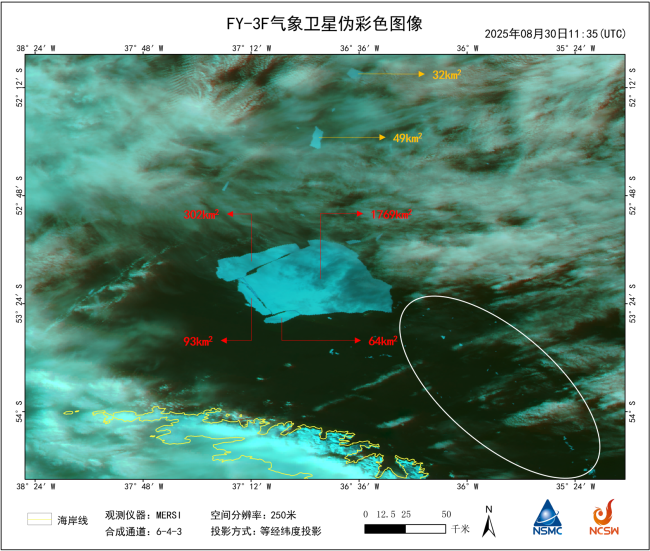 风云气象卫星捕捉到典型时间节点画面,更直观地展现了2025年A23a的形态变化与崩裂状况。例如,8月30日,风云三号F星监测到A23a发生大范围崩解,分裂出三座面积分别为302平方公里、93平方公里和64平方公里的冰山,本体剩余面积1769平方公里,这四座冰山仍紧密依靠在一起。