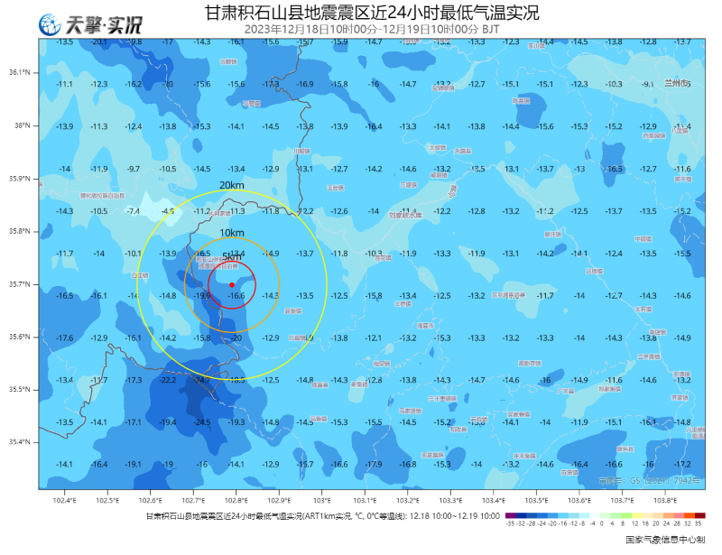 根据气象监测数据,19日6时,震中附近气温普遍低于-10℃,最接近震中的积石山吹麻滩站达到了-15.2℃的低温,距震中稍远一些的积石山石源站的气温也降到了-13.1℃,小时极大风速为2.1米/秒。寒冷的天气无疑给救援工作带来挑战。
