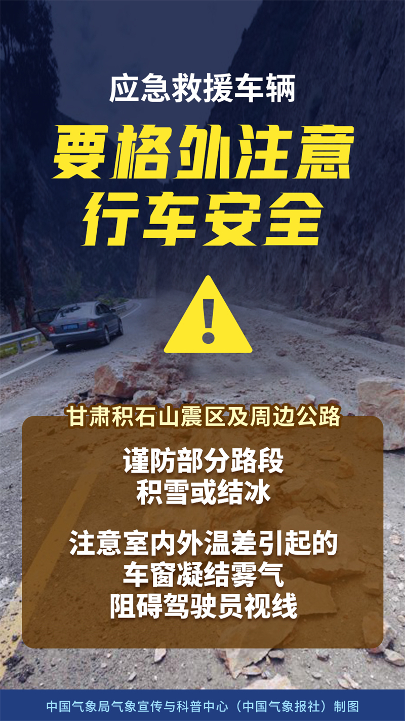 目前,抗震救灾各项工作正紧张有序进行。针对近期气温较低的情况,气象部门提示:救灾和避灾人员务必做好防寒保暖措施,在应急帐篷内取暖时要特别注意安全,使用明火时要谨防一氧化碳中毒。应急救援车辆在行驶过程中要格外注意行车安全。