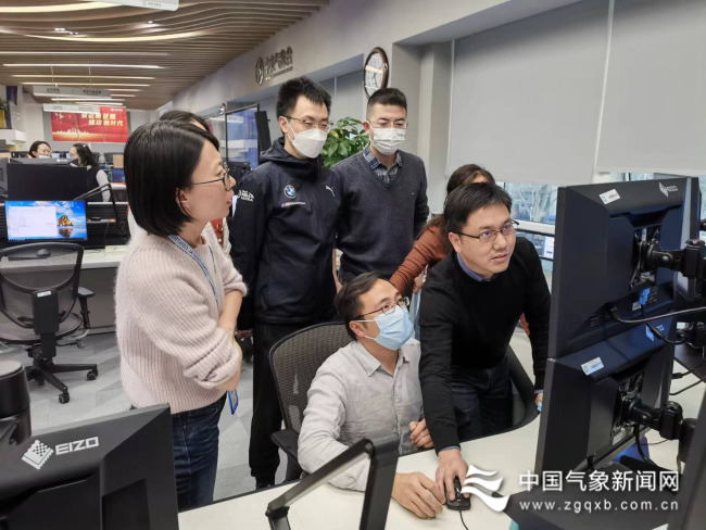 包红军(右一)与流域水文气象预报团队监测流域降水实况。杨寅 供图