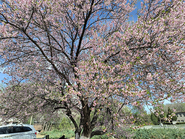 春日的某天,再次经过那棵“丑”树,我惊讶地发现那满树的花朵,白里透着粉,粉里透着红,一团团,一簇簇,点缀在枝条上。这一树的繁花从树枝开到树梢,不留一点缝隙,我被这万花锦簇瞬间惊艳了——“丑”树成了这里一道别样的风景。