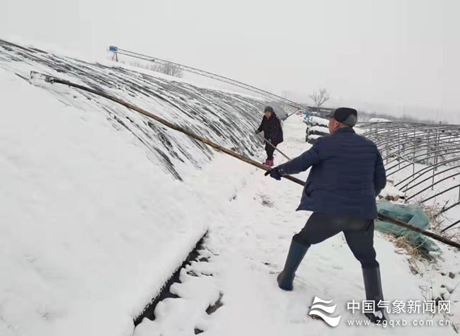 1月21日至22日,河北省邱县普降中雪,种植户及时清除蔬菜大棚的积雪。焦晶 摄影