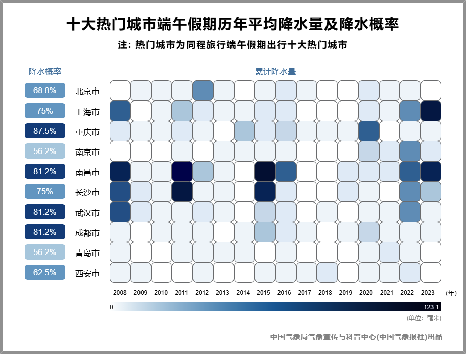 数据显示,端午假期,几乎全部热门城市的降水概率都在50%以上。处在华南至江南一带的热门旅游城市,如上海、南昌、武汉、长沙、南京等城市都曾在端午期间出现超过100毫米的降水。位于西南地区的成都和重庆,虽然降水量并不大,但降水概率都高达80%以上,大概率在游玩期间会遇上蒙蒙细雨。如果选择上述城市出行的朋友,别忘了随身携带雨具,做好欣赏别样风光的准备吧。