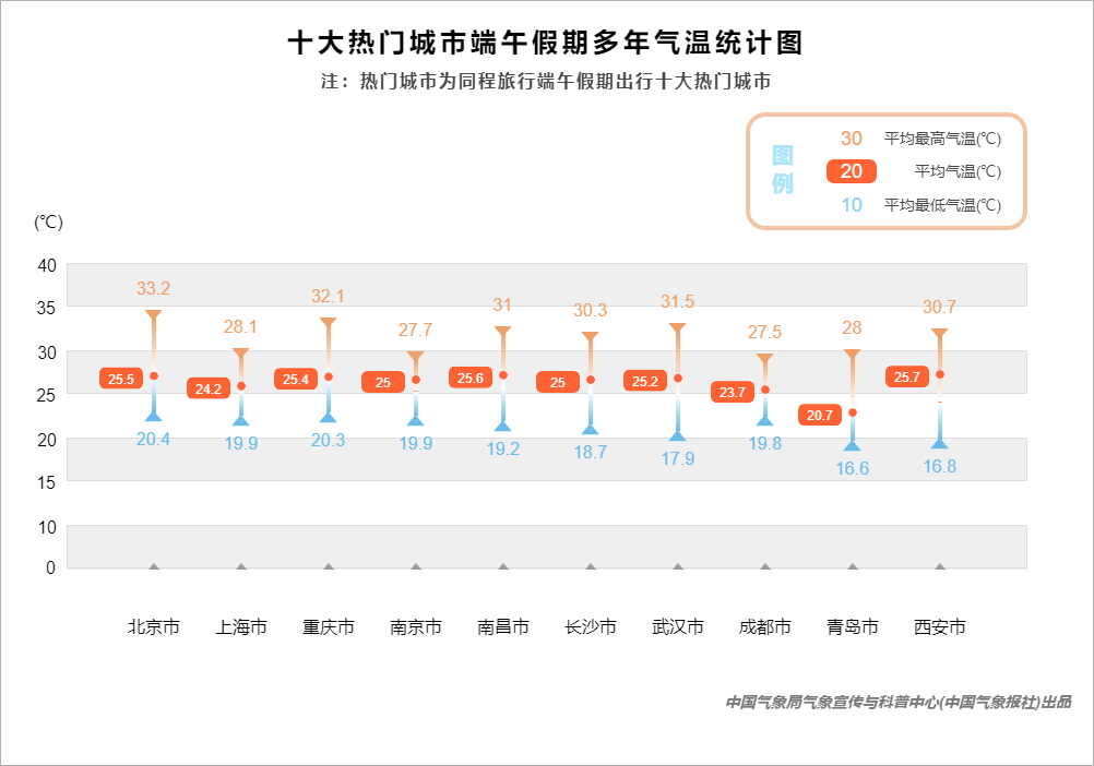 最低气温方面,大部分热门城市的最低气温在20℃左右,由于青岛的地理位置特殊,海边夜晚风凉,赏夜景时还需多加一件外套。另外,相比清明和五一假期,热门城市在端午节假期的早晚温差都相对较小。