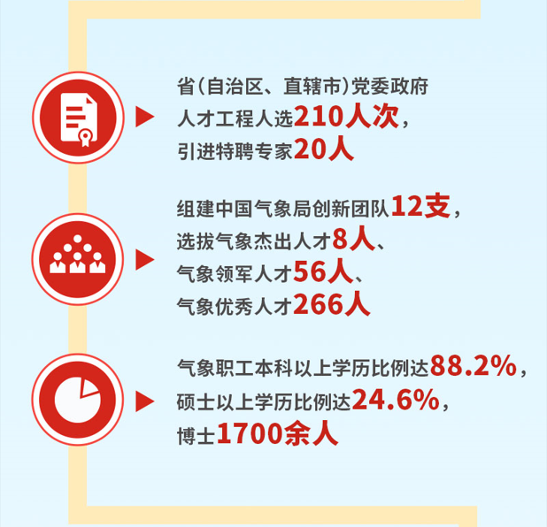 ——这十年,气象人才队伍整体素质显著提高。截至2021年底,气象职工本科以上比例达到88%,硕士以上比例达到25%,拥有博士1700余人;大气科学专业占比超过51%,气象人才队伍专业结构、学历结构、职称结构不断优化,初步建成以大气科学为主体、多种专业有机融合的高素质气象人才队伍。