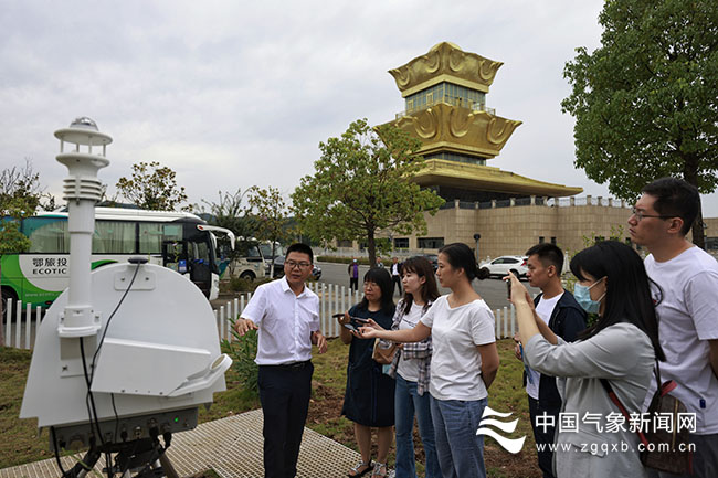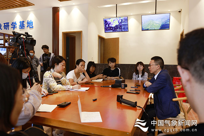 图为随州市气象局高级工程师许海波在中国气象局长江中游暴雨监测野外科学试验基地接受采访团采访 李必春 摄影