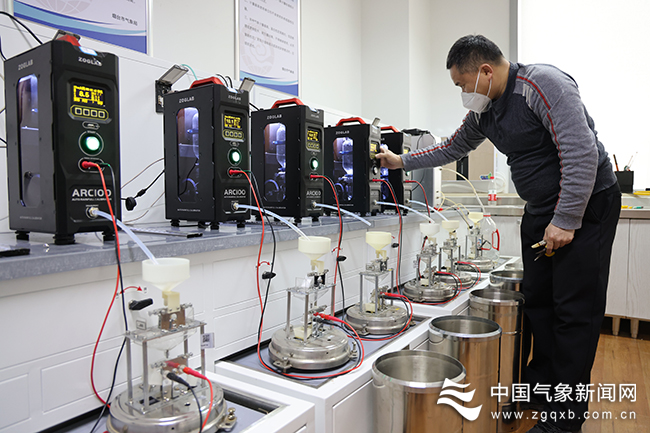 新春将至,山东省烟台市气象局对全市124个雨量传感器进行集中检定,为全市128个自动气象观测站稳定可靠运行提供坚实保障。 图为1月16日,山东省烟台市雨量传感检定室工作人员进行集中检定 马卓 摄影