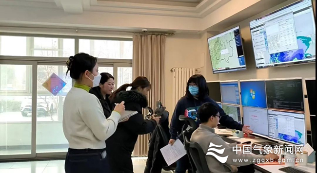 张玉洁(右二)向记者介绍春运气象服务平台小程序 北京市丰台区气象局 供图