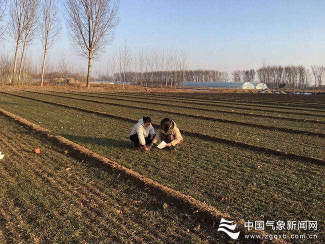 1月30日,农业和气象工作者正在察看苗情。图/郑文文