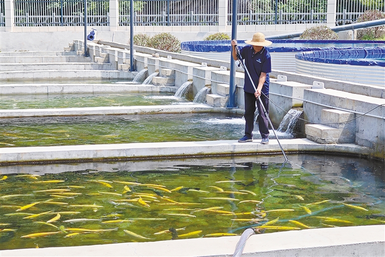 6月19日,记者来到商洛市商州区三岔河镇的国渔三岔河水产养殖示范园,只见井水缓缓流入鱼池,清澈见底的鱼池里,鱼儿自由游弋。示范园负责人赵海蒙正在利用园区的智慧管理平台,根据实时气象信息调整鱼池的进水量,控制水温。