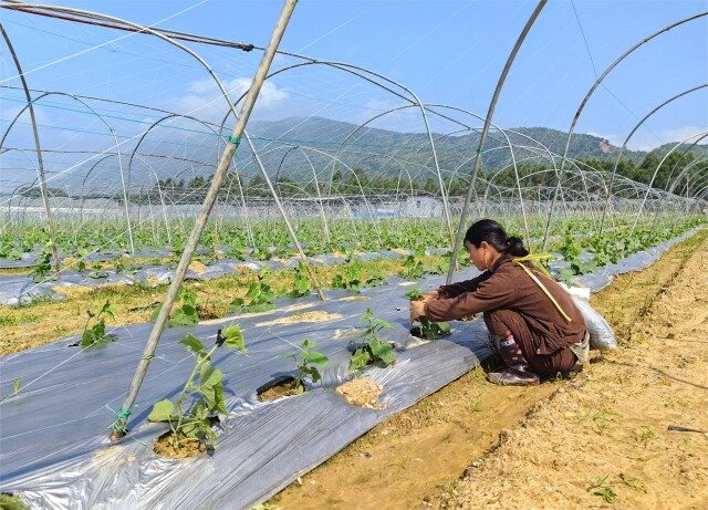 江永县广发农业有限公司下界头“粤港澳蔬菜”基地工人正对节瓜扶藤打枝。通讯员供图