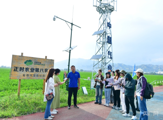 报道组在呼和浩特市土默特左旗万亩人工饲草气象观测示范区采访。 央广网发 胡云鹏 摄影