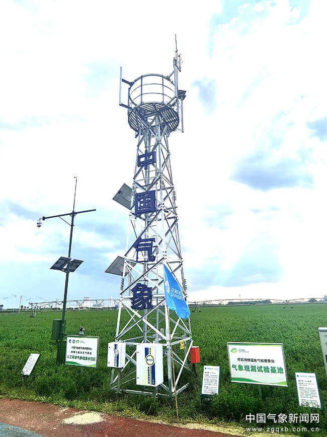 在苜蓿种植地的一角,是土默特左旗万亩人工饲草气象观测示范区。2023年,呼和浩特市气象局联合中国气象局气象探测中心、内蒙古自治区气象局打造国家级饲草观测基地,安装了蒸散量观测仪、轨道式植被观测仪、作物生育期智能识别监测仪、高标准农田试验仪等设备,并开展实况观测资料对比试验,提升观测基地观测数据应用能力和水平。
