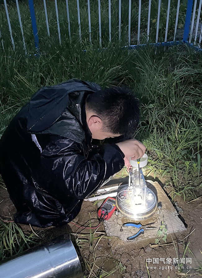 19日夜间,莘县气象局党支部党员于涛在雨中抢修魏庄站点的雨量传感器。莘县气象局供图