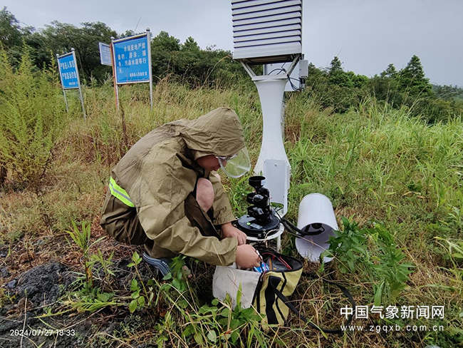 7月27日,气象装备技术人员维护区域自动气象站。王琳丽摄影