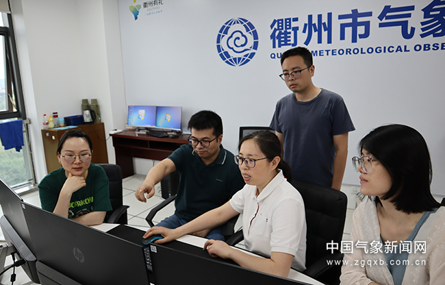 衢州市气象台台长王健疆(右二)与预报员一起研判天气形势。丁兮 摄影