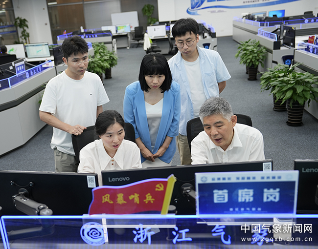6月25日,浙江省气象台值班预报员分析研判新安江流域降雨预报。苏桂炀 摄影