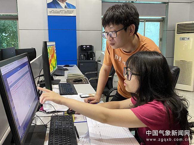 6月24日,南昌县气象台值班人员严密监测雷达回波,研判分析降水发展趋势。平师凡 摄影
