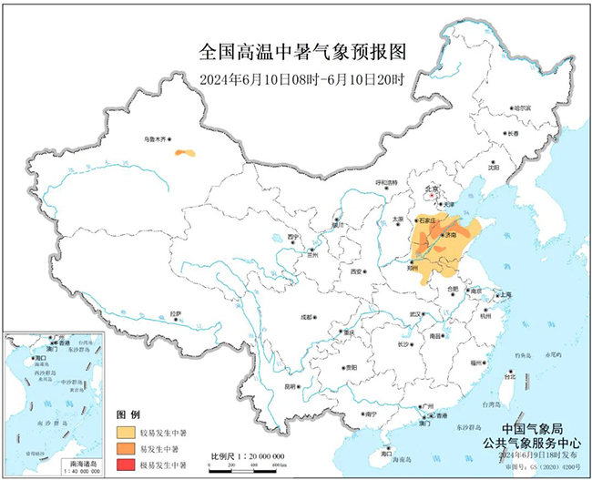 预计6月10日白天,北京、天津西部和南部、河北中南部、山东大部、河南大部、安徽北部、江苏北部以及新疆沿天山北部地区和南疆盆地东部、内蒙古东南部和西部、甘肃河西等地有35~36℃高温天气,其中,河北中南部、山东大部、河南中东部、安徽北部、新疆吐鲁番盆地等地部分地区最高气温37~39℃,河北南部、山东北部和西部、新疆吐鲁番盆地等地局地可达40℃以上。