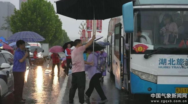 根据湖北省麻城市气象局发布的预警信息及出行提示,考生在暴雨中依然顺利抵达考场。马凯 摄影