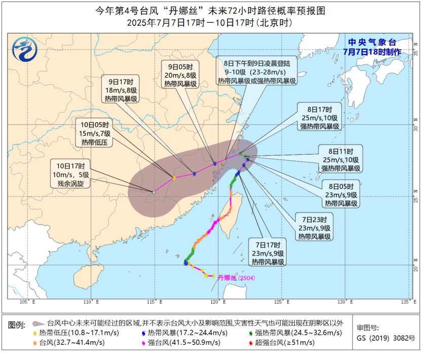 7月7日0时前后,今年第4号台风“丹娜丝”在台湾嘉义县沿海登陆。中央气象台最新路径预报显示,7日,“丹娜丝”以每小时10公里的速度向东北方向移动,并将于8日早晨开始逐渐转向偏西方向移动,预计在浙江台州至福建宁德一带沿海登陆。