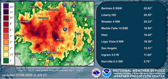 2023年7月3日中部时间7时至7月8日中部时间7时得克萨斯州中部雷达估算降雨量(单位:英寸)。右侧图版显示实际雨量计数据。来源:NOAA