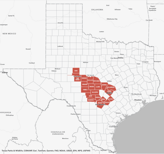 德克萨斯州地图,含洪灾初始声明中涉及的20个县区高亮标注。底图由ArcGIS/ESRI提供,县界数据源自德克萨斯州交通部通过ArcGIS Online平台提交