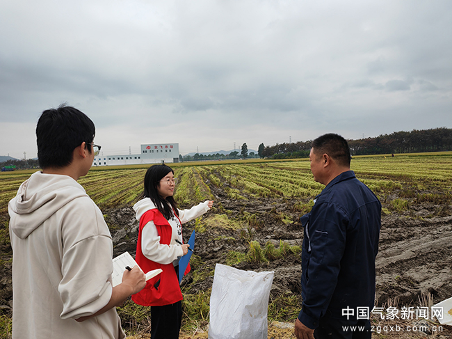10月30日,浙江省嘉兴市海盐县气象局农业气象人员赴云飞农场调研了解晚稻收割情况,并向农户介绍台风路径及可能造成的不利影响,指导农户做好晚稻抢收工作,确保颗粒归仓。许理家 摄影