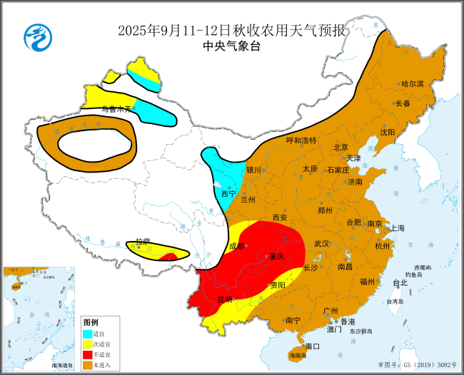 《专报》显示,今年秋季气象条件总体利于作物秋收秋种。未来十天,全国大部农区晴雨相间、气温偏高,东北地区主要粮食区初霜冻接近常年,气象条件整体利于秋粮作物充分灌浆和成熟收晒。西南地区、西北地区东部、华北南部、黄淮、江淮、江汉等地可能会出现3次降水过程,降水落区高度重叠,建议加强农田水利设施检修、疏通排涝机具、做好机收设备准备与调度,防范农田渍涝对作物灌浆成熟和秋收的不利影响。