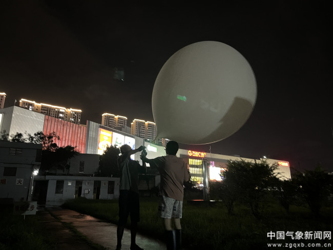9月23日晚,随着超强台风“桦加沙”的步步紧逼,广东省汕头市风雨交加。图为汕头市气象站工作人员正在顶风冒雨施放探空气球。陈锐鹏 摄影