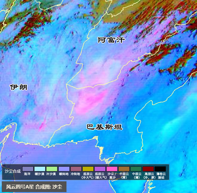 4月25日,受锋面云系后部偏北风的影响,阿富汗、巴基斯坦出现沙尘天气。25日16:00时(北京时)的 FY-4A沙尘多通道增强合成图像和真彩色图像监测显示(图1、2):沙尘主要位于阿富汗南部、巴基斯坦西部,其中巴基斯坦西部的沙尘区较为浓厚(图1粉色区)。