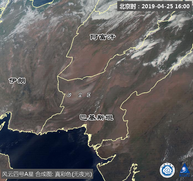 图1、FY-4A沙尘多通道增强合成图(2019年4月25日16:00,北京时)