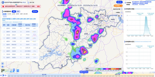 杭州市气象局联合应急管理部门开展“AI+短临提醒”应用场景建设,实现暴雨风险提醒5分钟更新、精细到乡镇(街道)。杭州市气象局供图
