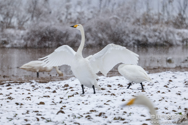 雪后,山西运城的黄河湿地三湾段,秒变“银白世界”,数千只越冬天鹅漫步雪滩、振翅嬉戏。权永军 摄影