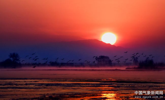 晨曦将天际晕染成鲜艳温暖的橙红,一轮圆日悬于远山之巅,柔光裹着朦胧雾气,铺洒在黑河河面,映出粼粼金光。群鸟振翅划破静谧,剪影与树影、山影交织,在冷暖色调的碰撞里,晕出西北湿地特有的苍茫与温柔。刘符军 摄影