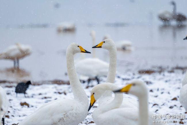 山西省运城市平陆县,越冬大天鹅或漫步雪滩,或振翅嬉戏,洁白羽毛与漫天飞雪相映成趣。权永军 摄影