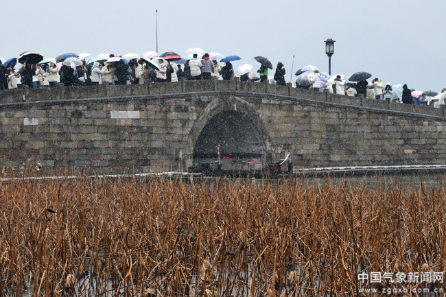 2月6日,浙江省杭州市出现明显降雪,西湖景区吸引众多游客前来欣赏雪景。里尔 摄影