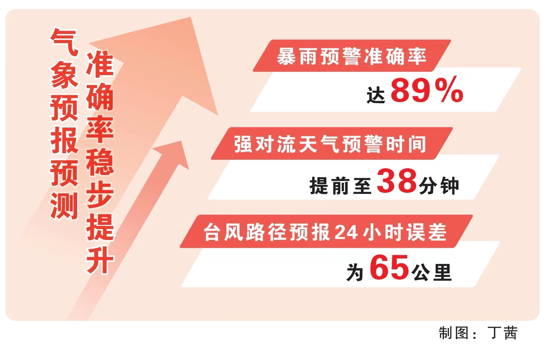 党的十八大以来,我国天气预报准确率和精细度持续提升,初步建成无缝隙智能网格预报产品体系,实现从站点、落区预报到数字格点预报的跨越,具备全球10天逐3小时10公里分辨率、全国24小时内逐小时5公里分辨率智能网格预报能力,可发布逐3小时滚动更新的强对流客观预报指导产品,台风路径预报等多项气象预报能力达世界先进水平。