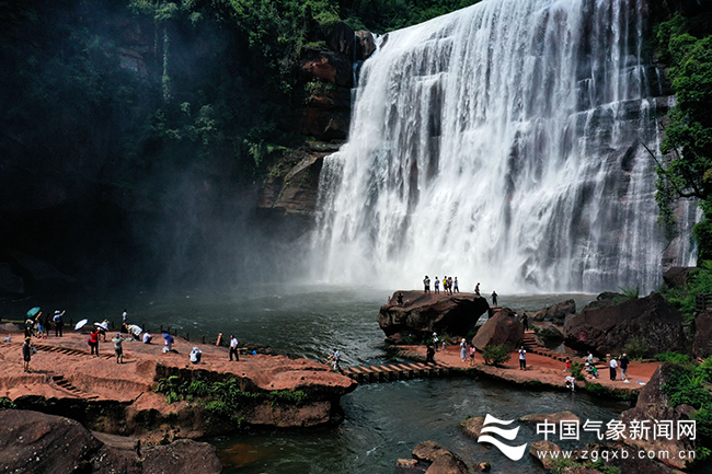 游客在长江水系第一大瀑布——贵州省赤水丹霞旅游区大瀑布前游览。 图/易盛武