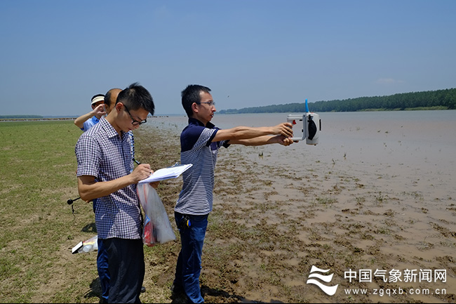 湖北省荆州市气象局科研人员在石首天鹅洲麋鹿保护区开展光谱监测。荆州市气象局供图