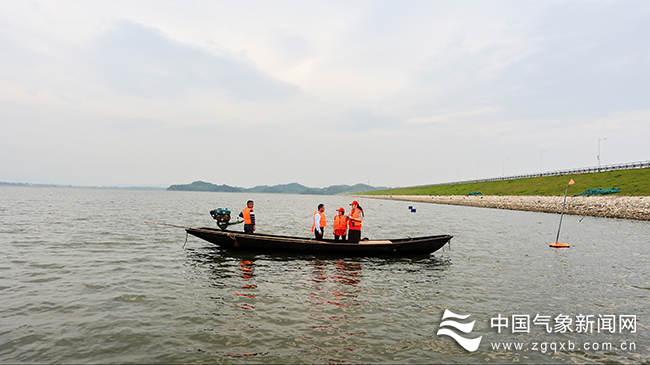 江西省九江市湖口县气象局工作人员在该县南北港江豚保护基地乘船观测气象数据,记录江豚出水活动、频率等。 图/魏东升