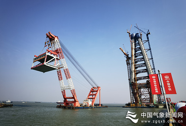 2023年2月1日,江苏省常泰长江大桥主航道桥首个大节段钢桁梁顺利完成吊装。图/彭晔丹