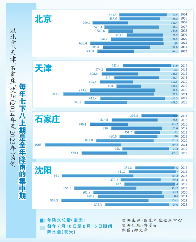 相较于长江中下游,我在华北的降雨显得更加豪迈与直接。以北京、天津、石家庄、沈阳城市为例,近10年(2014年至2023年),我所在期间的降雨量几乎可以占到全年总雨量的一半,也就是一年中一半多的雨都下在这一时期了。