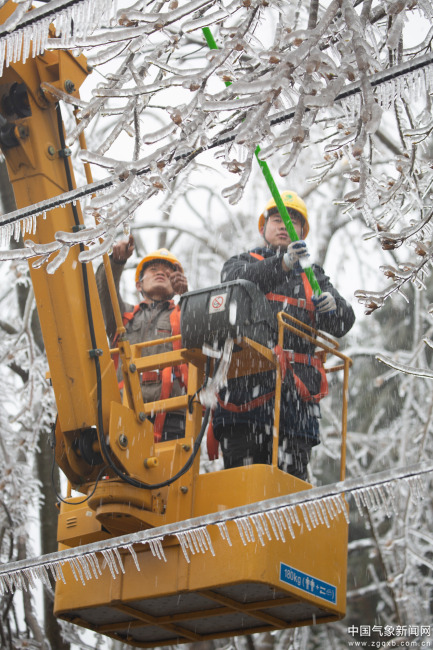 安徽省怀宁县气象工作人员在测量电线积冰。图/文 徐红玲 鲍超
