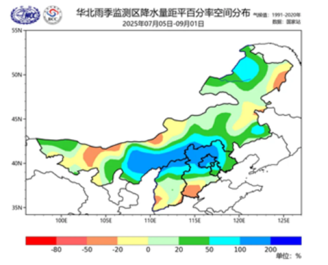 2025年华北雨季开始时间之早、雨季之长和累计雨量之多均为1961年以来之最。开始最早:自2025年7月5日开始,较常年(7月18日)偏早13天;于2025年9月2日结束,较常年(8月17日)偏晚16天。持续时间最长:达59天(不含结束日),较常年(30天)偏长29天。累计雨量最大:雨季降水量356.6毫米,较常年(136.6毫米)偏多1.6倍。