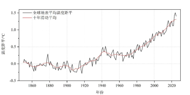 图为1850年至2025年全球地表平均温度距平序列(相对1850年至1900年平均值)
