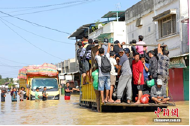 图为2025年11月30日,印度尼西亚苏门答腊岛受灾民众乘卡车出行