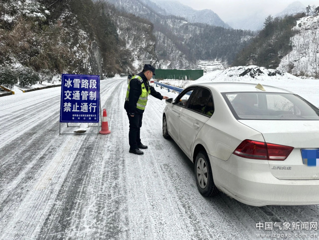 收到道路结冰预警后,县公安局交通管理大队在危险路段采取交通管制措施 镇坪县气象局供图